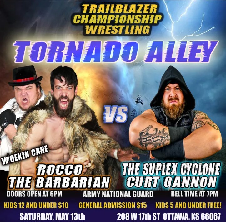 Match highlights of Rocco The Barbarian W/Dekin Cane VS “The Suplex Cyclone” Curt Gannon at our May 13th, 2023 event “TORNADO ALLEY”