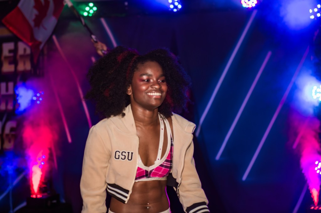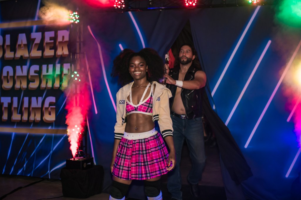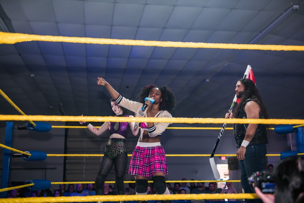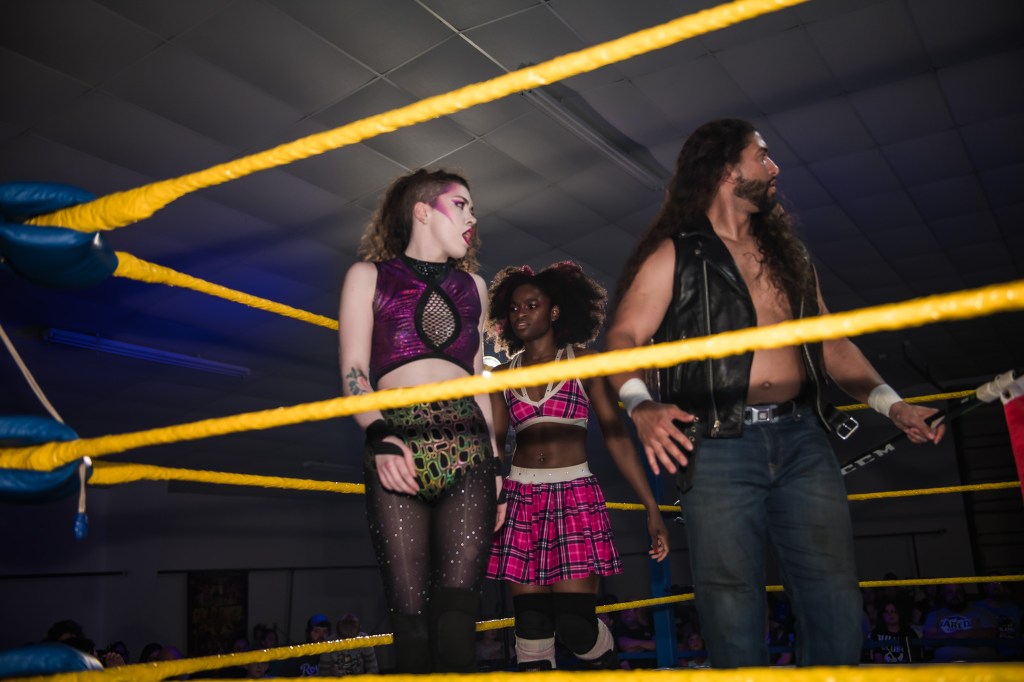 “The Phoenix Princess” Aminah Belmont w/ “Manager of Champions” SBC teamed up with “The Versace of Violence” Nixi XS to take on “The Little Blue Dragon” Tootie Lynn and her mystery partner Skylar Sparks at TRAILBLAZER GOLD RUSH!