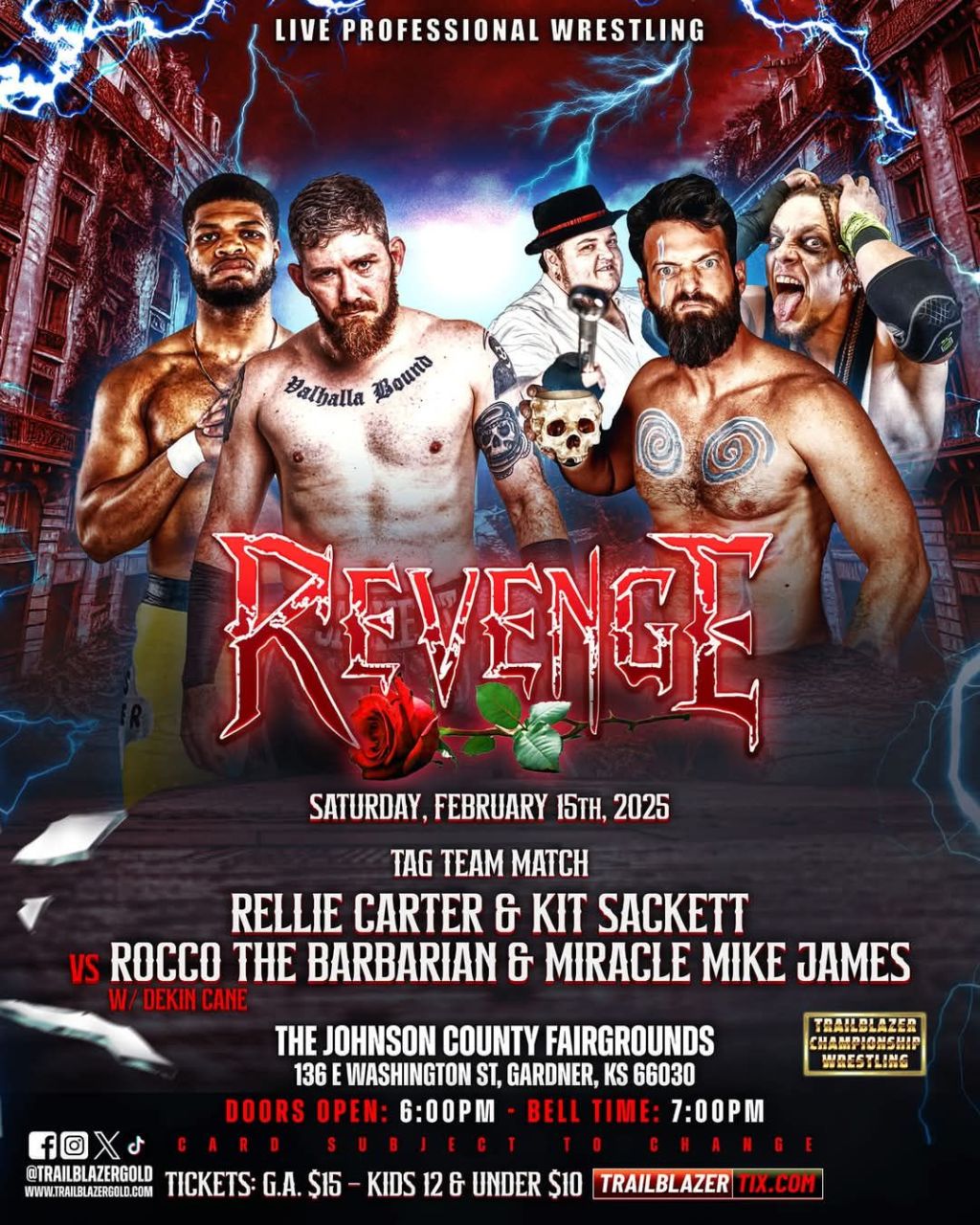 On Saturday Feburary 15th Rellie Carter makes his Trailblazer debut teaming with Kit Sackett to face off against the team of Rocco The Barbarian and Miracle Mike James with Dekin Cane in their corner at